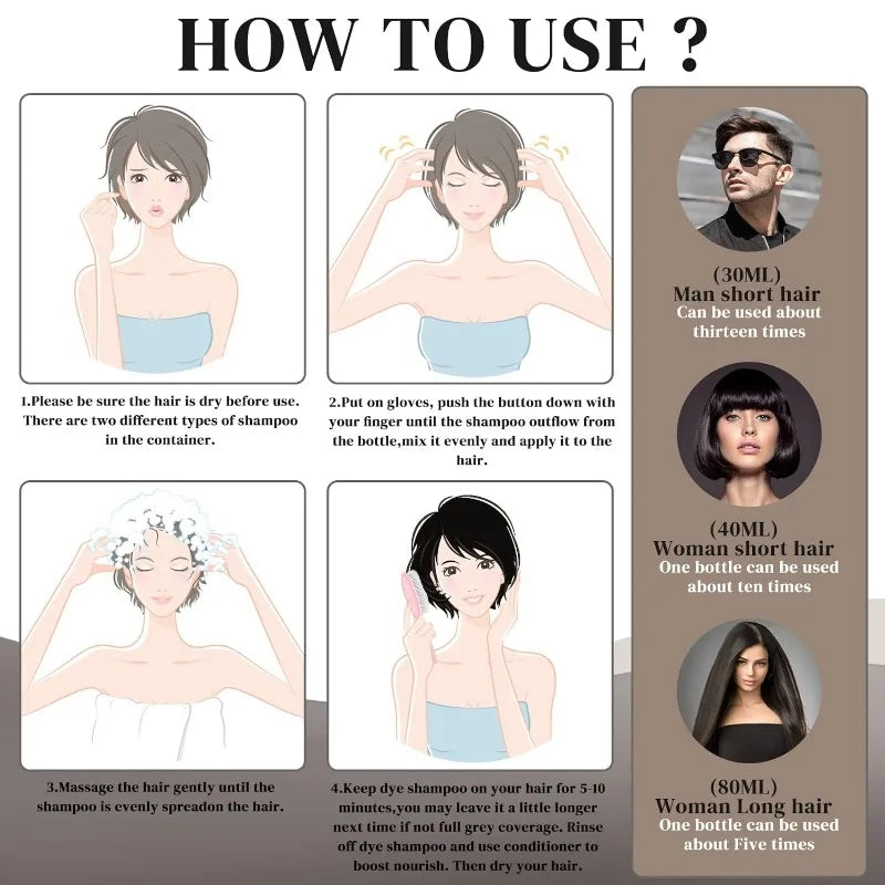 Unlike traditional hair dyes, this shampoo is incredibly easy to use. Acting as a dye, shampoo, and conditioner all in one, it eliminates the need for multiple products and lengthy treatments. Simply apply it like regular shampoo during your shower, and in just 5-10 minutes, watch your gray hair transform into natural-looking black. The shampoo cleanses and conditions at the same time, leaving your hair soft, smooth, and manageable after each use.